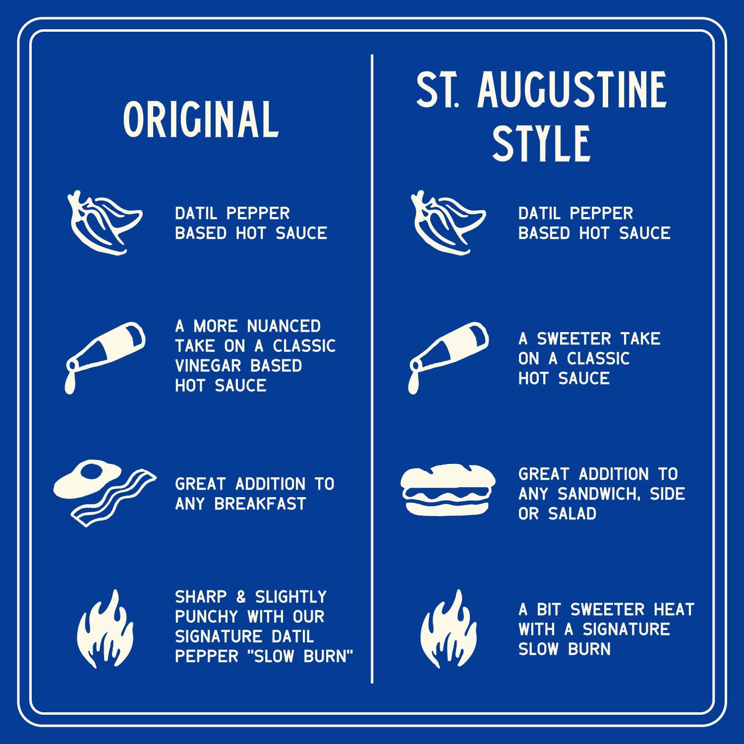 - St. Augustine Style: Sweeter, fruitier heat with the signature Datil Pepper slow burn - our tribute to how traditional Datil Pepper sauces are made where the peppers are grown. Try it in a sandwich, breakfast burrito, as a marinade, in a spicy aioli, or sauteed into some onions!